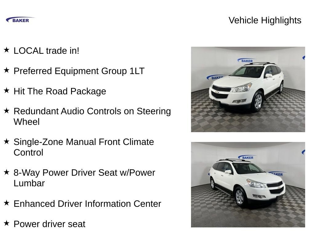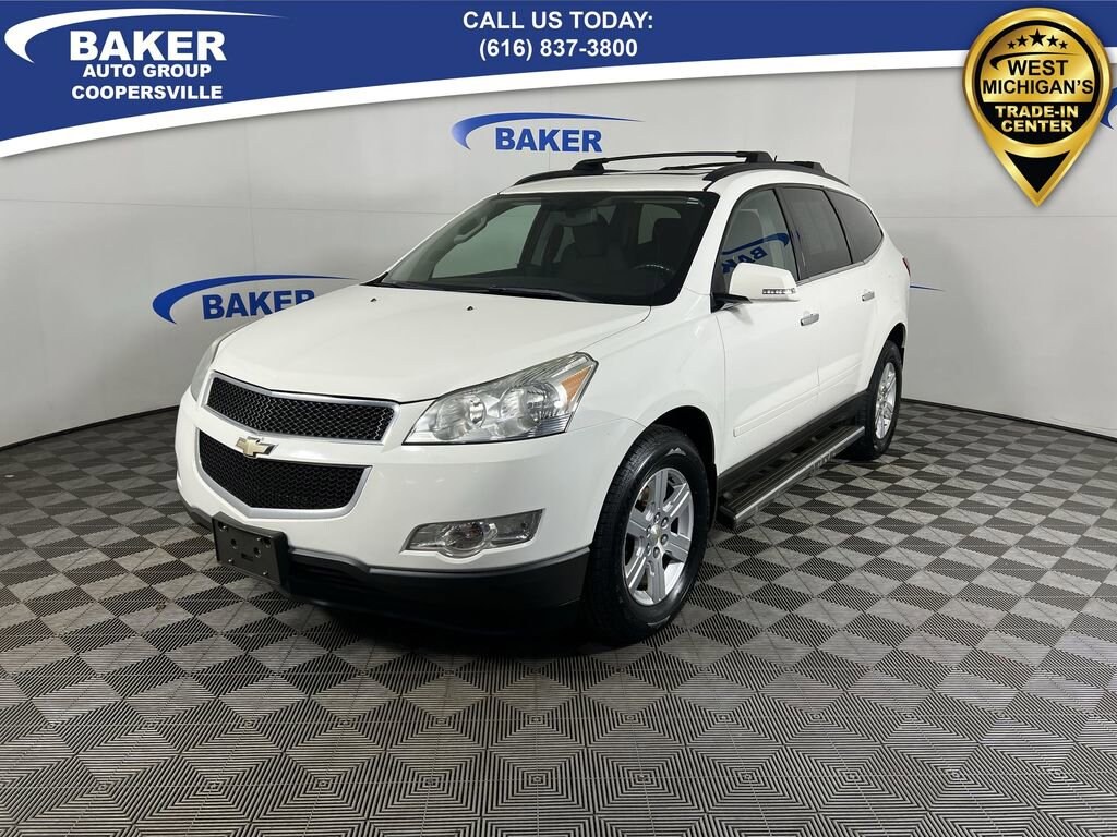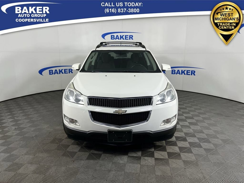 New Price! White 2011 Chevrolet Traverse LT 1LT AWD 6-Speed Automatic Electronic with Overdrive 3.6L V6 SIDI LOCAL trade in!, Traverse LT 1LT, 3.6L V6 SIDI, 6-Speed Automatic Electronic with Overdrive, AWD, White, Ebony w/Premium Cloth Seat Trim, 18 x 7.5 Machined Aluminum Wheels, 7-Passenger Seating (2-2-3 Seating Configuration), 8-Way Power Driver Seat w/Power Lumbar, Chrome Assist Steps, Digital Compass, Dual SkyScape 2-Panel Power Sunroof, Enhanced Driver Information Center, Hit The Road Package, Integral Spotter Blind-Zone Mirrors, Power driver seat, Preferred Equipment Group 1LT, Programmable Remote Keyless Entry, Redundant Audio Controls on Steering Wheel, Roof Rack Longitudinal C-Channels & Cross Rails, Single-Zone Manual Front Climate Control, Ultrasonic Rear Parking Assist, Variable Effort Power Steering.