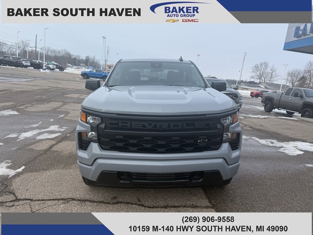 Slate Gray Metallic 2025 Chevrolet Silverado 1500 Custom 4WD 8-Speed Automatic 2.7L I4 Turbocharged DOHC 16V LEV3-SULEV30 310hp 4WD, ONE OWNER, 8-Speed Automatic, 4WD, Black Cloth, 10-Way Power Driver Seat w/Lumbar, 120-Volt Bed Mounted Power Outlet, 120-Volt Interior Power Outlet, 3.5 Monochromatic Display Driver Info Center, Black Name Plates (LPO), Bluetooth® For Phone, Color-Keyed Carpeting Floor Covering, Custom Convenience Package, Custom Value Package, Dark Essentials Package (LPO), Deep-Tinted Glass, Dual Rear USB Ports (Charge Only), Electric Rear-Window Defogger, Electronic Cruise Control, EZ Lift Power Lock & Release Tailgate, Front Frame-Mounted Black Recovery Hooks, Front Rubberized Vinyl Floor Mats, HD Rear Vision Camera, Hitch Guidance, LED Cargo Area Lighting, Manual Tilt Wheel Steering Column, OnStar Services Capable, Power Front Windows w/Driver Express Up/Down, Power Front Windows w/Passenger Express Down, Power Rear Windows w/Express Down, Preferred Equipment Group 1CX, Rear 60/40 Folding Bench Seat (Folds Up), Rear Rubberized-Vinyl Floor Mats, Remote Keyless Entry, Remote Vehicle Starter System, SiriusXM Trial Subscription, Standard Tailgate, Teen Driver, Theft Deterrent System (Unauthorized Entry), Tire Pressure Monitoring System, Trailering Package, Wi-Fi Hot Spot Capable.