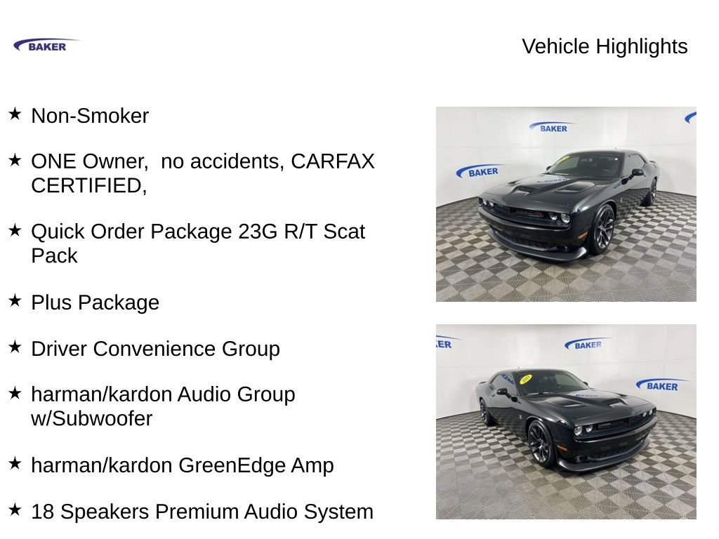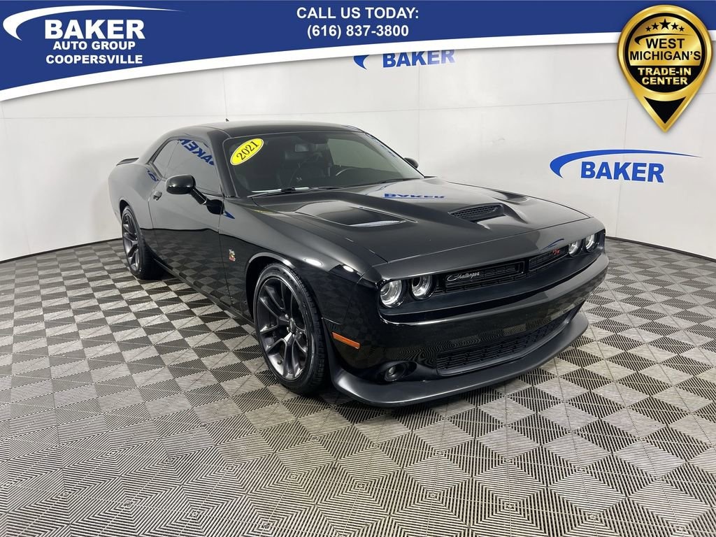 New Price! Pitch Black Clearcoat 2021 Dodge Challenger R/T Scat Pack RWD Tremec 6-Speed Manual SRT HEMI 6.4L V8 Non-Smoker, ONE Owner, no accidents, CARFAX CERTIFIED,, Challenger R/T Scat Pack, 2D Coupe, SRT HEMI 6.4L V8, RWD, Pitch Black Clearcoat, Black Artificial Leather, 18 Speakers Premium Audio System, Blind Spot & Cross Path Detection, Door Trim Panel w/Ambient Lighting, Driver Convenience Group, harman/kardon Audio Group w/Subwoofer, harman/kardon GreenEdge Amp, Heated Steering Wheel, High-Intensity Discharge Headlamps, Plus Package, Power Multi-Function Foldaway Mirrors, Power Tilt/Telescope Steering Column, Premium-Stitched Dash Panel, Quick Order Package 23G R/T Scat Pack, Radio/Driver Seat/Mirrors Memory, Surround Sound, Trunk Mounted Subwoofer.