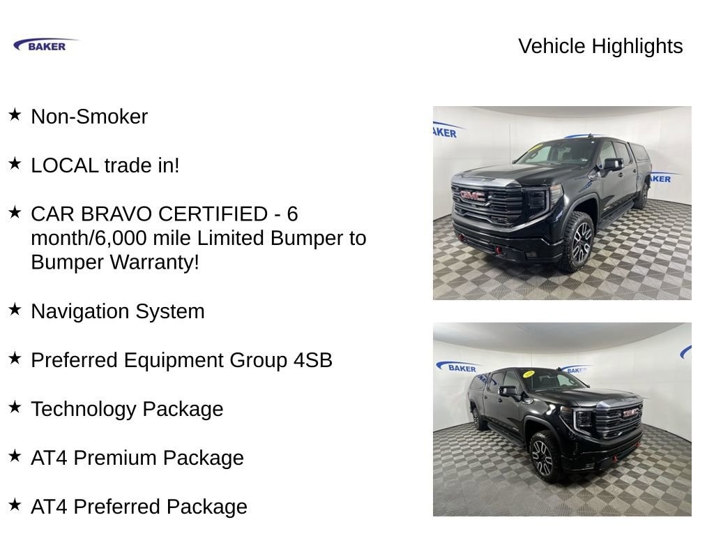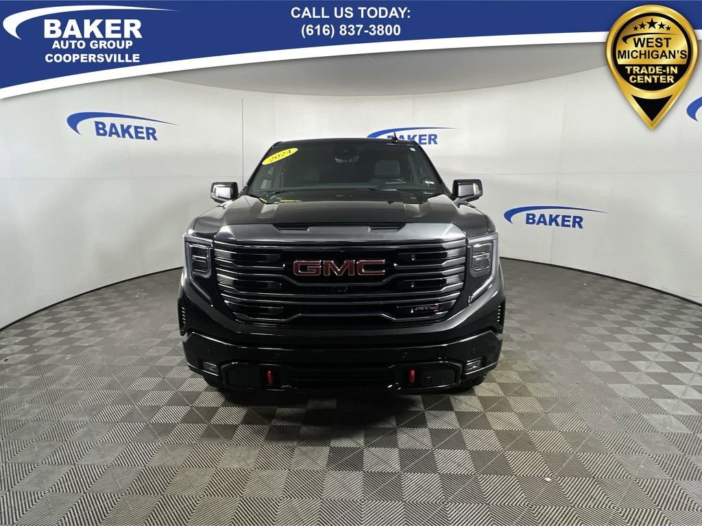 Onyx Black 2024 GMC Sierra 1500 AT4 4WD 10-Speed Automatic 3.0L I6 Non-Smoker, LOCAL trade in!, CAR BRAVO CERTIFIED - 6 month/6,000 mile Limited Bumper to Bumper Warranty!, Sierra 1500 AT4, 3.0L I6, 10-Speed Automatic, 4WD, Onyx Black, Jet Black With Kalahari Accents Leather, 10-Way Power Driver Seat Adjuster w/Lumbar, 10-Way Power Passenger Seat Adjuster w/Lumbar, 120-Volt Bed Mounted Power Outlet, 120-Volt Interior Power Outlet, 2 Charge/Data USB Ports Inside Center Console, 2 Type-C Charge-Only Rear USB Ports, 2 USB Ports, Apple CarPlay/Android Auto, AT4 Preferred Package, AT4 Premium Package, Auto-Locking Rear Differential, Automatic temperature control, Bed View Camera, Black Chrome Header & Grille Insert Bars, Deep-Tinted Glass, Driver Memory, Floor-Mounted Center Console, Front Prem Floor Liners w/Removable Carpet Insert, Front Rain-Sensing Wipers, GMC Connected Access Capable, HD Surround Vision, Heated front seats, Heated rear seats, Hitch View, In-Vehicle Trailering System App, Integrated Trailer Brake Controller, LED Cargo Area Lighting, Memory seat, Navigation System, Off-Road High Clearance Step (LPO), Perimeter Lighting, Power Door Locks, Power driver seat, Power passenger seat, Power Sliding Rear Window w/Rear Defogger, Power Sunroof, Preferred Equipment Group 4SB, Premium Bose 7-Speaker Sound System, Push Button Start, Rear Camera Mirror, Rear Cross Traffic Braking, Rear Pedestrian Detection, Rear Wheelhouse Liners, Red Recovery Hooks, Remote Vehicle Starter System, SiriusXM w/360L, Spray-On Pickup Bedliner w/AT4 Logo, Technology Package, Theft Deterrent System (Unauthorized Entry), Trailer Camera Provisions, Trailer Side Blind Zone Alert, Trailering Package, Ultrasonic Front & Rear Park Assist, Universal Home Remote, Ventilated front seats, Wheels: 20 x 9 Machined Aluminum, Wi-Fi Hotspot Capable, Wireless Apple CarPlay/Wireless Android Auto, Wireless Charging.CALL US TODAY 6168373800. Recent Arrival! Odometer is 855 miles below market average!