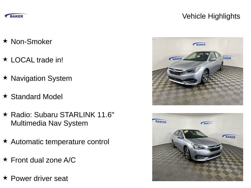 New Price! Ice Silver Metallic 2022 Subaru Legacy Limited XT AWD Lineartronic CVT 2.4L 4-Cylinder DOHC 16V Non-Smoker, LOCAL trade in!, Legacy Limited XT, 4D Sedan, 2.4L 4-Cylinder DOHC 16V, Lineartronic CVT, AWD, Slate Black w/Perforated Leather-Trimmed Upholstery, Automatic temperature control, Exterior Parking Camera Rear, Front dual zone A/C, Heated front seats, Heated rear seats, Heated steering wheel, Memory seat, Navigation System, Power driver seat, Power moonroof, Power passenger seat, Radio: Subaru STARLINK 11.6 Multimedia Nav System, Standard Model, STARLINK/Apple CarPlay/Android Auto, Wheels: 18 x 7.5J Aluminum-Alloy Black.
